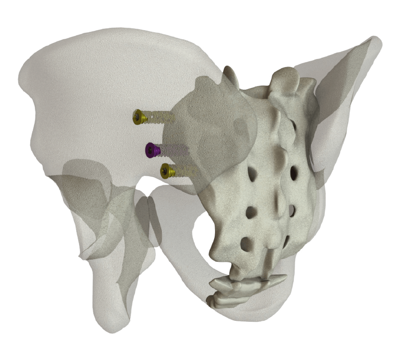 Implante totalmente roscado, autoperfurante e autotravante, com fenestrações helicoidais que favorecem a incorporação óssea e garantem alta estabilidade na articulação sacroilíaca.